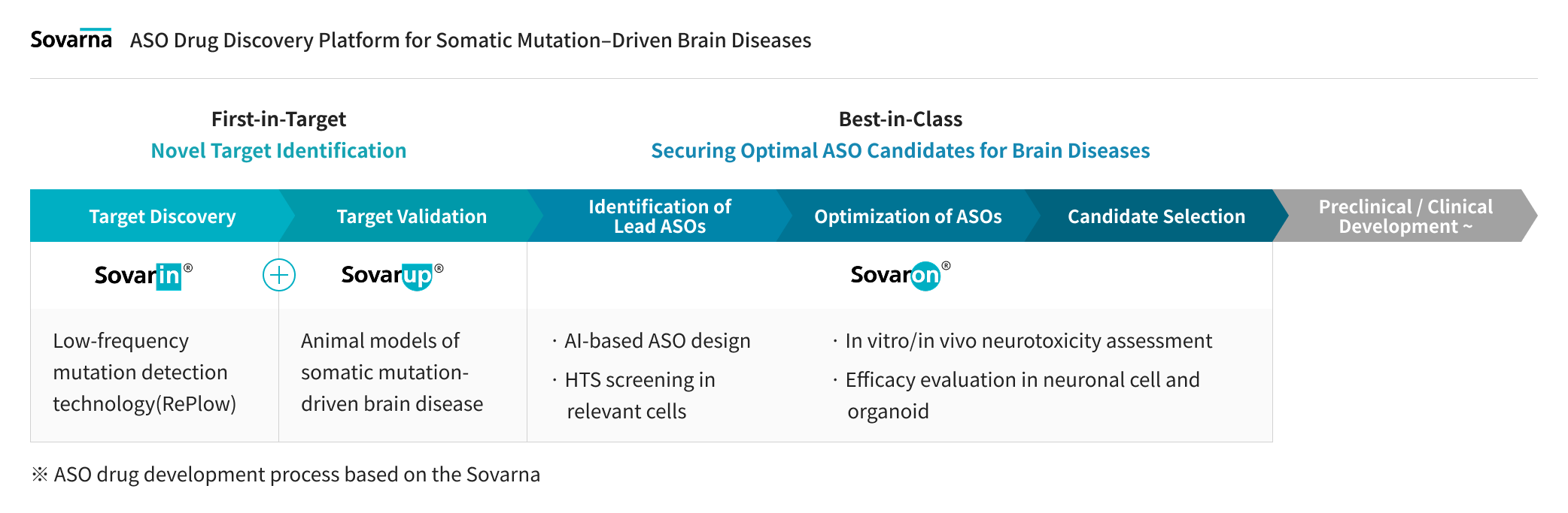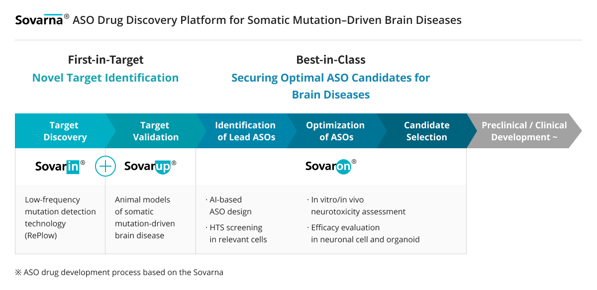 Sovarup is a specialized translational research model designed to revolutionize the study of brain disorders. Unlike traditional models that focus solely on symptoms (phenotypes), Sovarup introduces disease-causing somatic mutations directly into the same cell types where the disease originates in humans. This allows for the precise recapitulation of the entire pathological journey—from the initial onset to the full progression of the brain disorder. By overcoming the inherent limitations of conventional animal models, Sovarup provides high-fidelity translational data optimized to increase clinical success rates. Newly identified targets based on somatic mutations, discovered via Sovarin and Sovarup, represent novel therapeutic opportunities. These insights enable the development of first-in-class innovative drugs and unlock the potential of low-frequency somatic mutations as powerful molecular diagnostic markers.